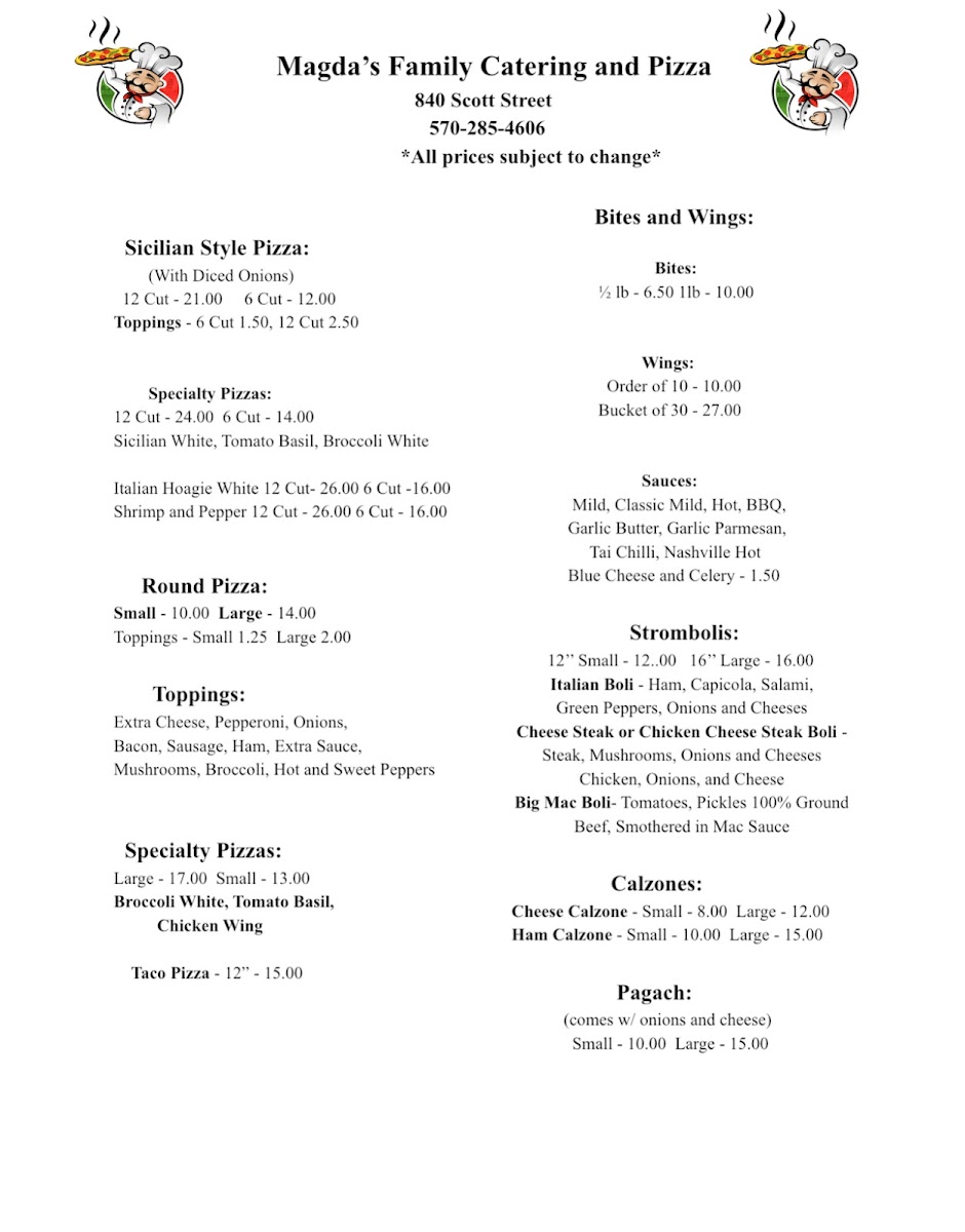 Welcome to Magda's Family Catering and Pizza, a hidden gem located at 840 Scott St, Wilkes-Barre, PA. This inviting pizza restaurant offers a delightful menu that caters to both pizza lovers and fans of club sandwiches alike. The highlight here is their specialty pizzas, which include unique options like the Broccoli White and Chicken Bacon Ranch, all made with fresh ingredients. Customers rave about the flavor-packed sauces and light, airy crust that melts in your mouth, setting them apart from the competition.